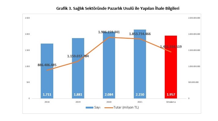 Türkiye’de sağlık ürün ve hizmetleri ile ilgili son 4 yılda ortalama olarak tutarı 1,45 Milyar TL civarında, 1.950 civarında pazarlık usulü ile yapılan ihale sonuçlandırılmıştır. 2020 yılında 2019 yılına göre; pazarlık usulü ile yapılan ihale sayıları %10 civarında, ihale tutarları ise %65 civarında artmıştır. 2021 yılında 2020 yılına göre; pazarlık usulü ile yapılan ihale sayıları %3 civarında artmış fakat ihale tutarları %2 civarında azalmıştır.