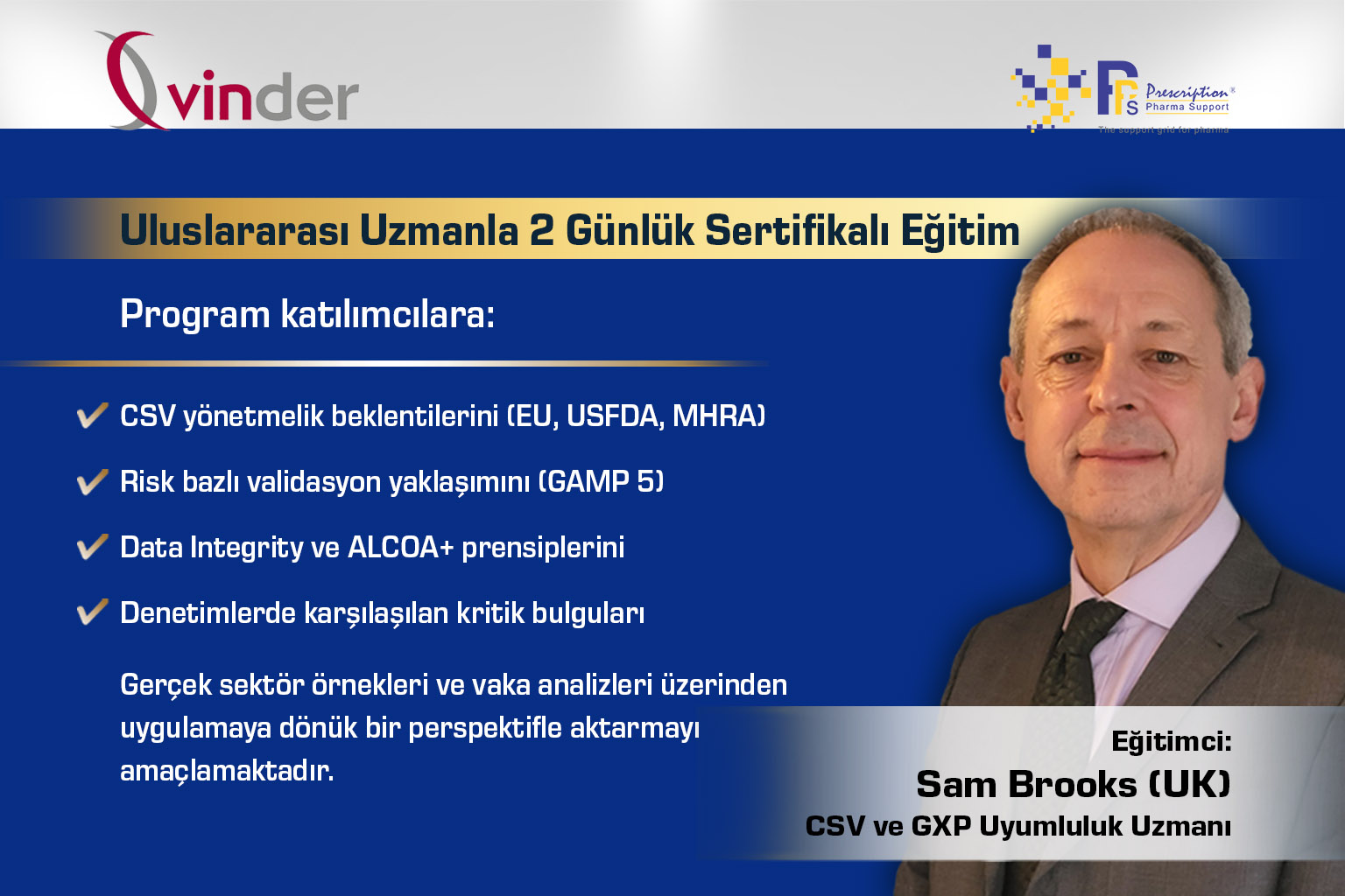 Bu uygulamalı eğitimi Novartis’te uzun yıllar Global Head of IT Compliance görevini üstlenmiş ve CSV ile GxP uyumu alanında 30 yılı aşkın deneyime sahip Sam Brooks (UK) verecek.