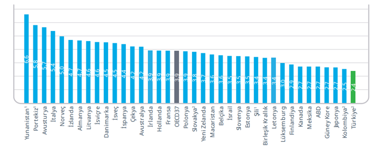 Grafik, OECD ülkeleri arasında hekim yoğunluğu açısından ciddi bir ayrışma olduğunu; Türkiye’nin ise bu dağılımda en alt grupta yer aldığını göstermektedir. Türkiye’de hekim sayısının nüfusa oranla düşük olması, tek başına bir “nicelik eksikliği”nden ziyade, sağlık sisteminin tüm diğer göstergeleriyle birlikte okunduğunda çok katmanlı bir yapısal baskıya işaret etmektedir.