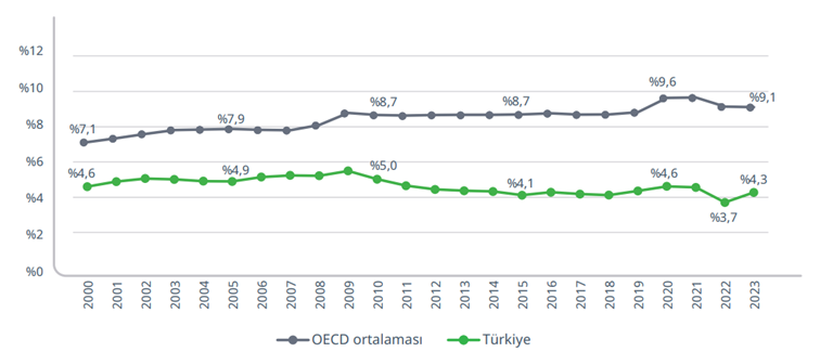 Şekil 5. Türkiye ve OECD’de Cari Sağlık Harcamalarının GSYH İçindeki Payı (2000-2023)