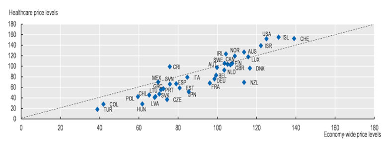Şekil 3. Sağlık hizmeti fiyat seviyelerinin ekonomi genelindeki fiyat seviyeleriyle karşılaştırılması, 2023 (OECD ortalaması = 100)