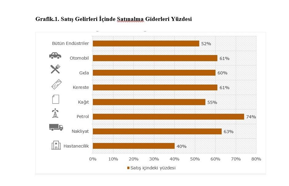 Hastane giderleri içerisinde Tedarik Zincirine ilişkin giderler personel ve hekim giderlerinden sonra en yüksek paya sahip giderler olarak karşımıza çıkmaktadır. Grafik 1. de de görüleceği üzere toplam satış gelirlerine oranla bakıldığında hastanelerde yaklaşık %40 lar civarında bir oranın satınalma marifetiyle yapılan alımlardan oluştuğu görülmektedir. Üretim gibi hammadde kaynaklı sektörlerde bu oran çok daha yüksekken hizmet odaklı sektörlerde bu oran kısmen daha sınırlıdır. Bu denli büyük oranda paya sahip olan bir sürecin bütününde tüm uygulamalarının detaylıca analiz edilmesi ve israf kaynaklarının tespit edilerek doğru süreçlerin işletilmesi gerekmektedir. Zincirin her aşamasında sistem içerisindeki kaynakların boşa harcanmasına neden olan ve değer yaratmayan faaliyetlerin ortadan kaldırılması amacıyla işletme süreçlerinin yeniden yapılandırılması gerektiğini savunan yalın tedarik zinciri, işletmenin tüm fonksiyonlarının bütünleştirilmesini sağlar. Bu sayede yüksek kullanım oranı, daha kısa teslim süreleri ve toplam tedarik zinciri maliyetlerinin en aza indirilmesi sağlanabilecektir.
