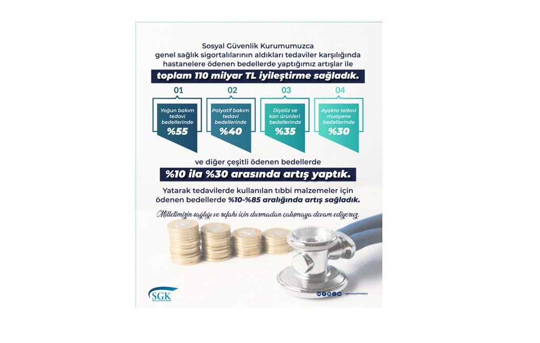 SGK’nın X sosyal medya hesabından tebliğe ilişkin yapılan paylaşımda, “Sosyal Güvenlik Kurumumuzca genel sağlık sigortalılarının aldıkları tedaviler karşılığında hastanelere ödenen bedellerde yaptığımız artışlar ile toplam 110 milyar lira iyileştirme sağladık. Yoğun bakım tedavi bedellerinde yüzde 55, palyatif bakım tedavi bedellerinde yüzde 40, diyaliz ve kan ürünleri bedellerinde yüzde 35, ayakta tedavi muayene bedellerinde yüzde 30, diğer çeşitli ödenen bedellerde yüzde 10 ila yüzde 30 arasında artış yaptık. Yatarak tedavilerde kullanılan tıbbi malzemeler için ödenen bedellerde yüzde 10-85 aralığında artış sağladık. Milletimizin sağlığı ve refahı için durmadan çalışmaya devam ediyoruz” ifadelerine yer verildi.